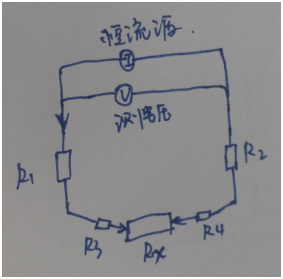采用恒流源測(cè)量方式,R1和R2為導(dǎo)線電阻,R3與R4為測(cè)試件與測(cè)量?jī)x器之間的接觸電阻(一般為測(cè)試夾、測(cè)試針),實(shí)際測(cè)量電阻值為R1+R2+R3+R4+Rx的總和;
