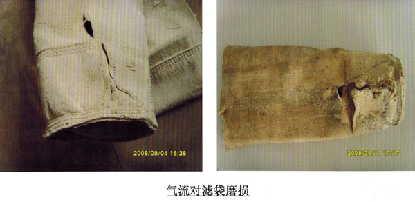 除塵器布袋在使用過程中經(jīng)常會出現(xiàn)除塵器濾袋口損壞的現(xiàn)象,而且這一現(xiàn)象出現(xiàn)還是比較嚴(yán)重的,到底是何原因致使除塵布袋漲圈下面20公分左右出現(xiàn)損壞呢?主要原因_是袋式除塵器的噴吹管上面打的噴吹眼不正,袋式除塵器噴吹管不正會直接影響除塵濾袋的使用壽命,濾袋的破損出現(xiàn)在距袋u向下左右處,此處???為側(cè)面破損沿噴吹管方向連續(xù)幾個排列,在煙氣流也方向側(cè)磨損較重,有的濾袋甚至發(fā)生圓周性斷裂,其破損應(yīng)為氣體攜帶灰粒由內(nèi)向外向下沖刷而成,濾袋內(nèi)部出現(xiàn)由上至下的大片織布磨損現(xiàn)象,并露出自色PTFE基布,分析原因為噴吹管噴吹時夾帶灰粒氣流被煙氣引流導(dǎo)致氣流偏斜至煙氣流出方向。對于針刺濾袋一部分_細(xì)粉塵進人纖維層內(nèi),噴吹氣流在清灰時因氣流不暢,不能很好將能量釋放,在袋內(nèi)形成強大的氣流而沖擊濾袋,造成濾袋晃動互相磨損袋底,以及將袋底吹裂。另一部分氣流從袋日返出,從而磨損袋口。濾袋底部側(cè)壁的作用力_加強大。此時,如果噴吹壓力偏大,袋身過濾含濕量大的煙氣后透氣性變差,袋底腐蝕“塑化”、強力下降,造成濾袋底部出現(xiàn)沿袋底縫線圓周折皺折裂痕跡。第四,該除塵器使用的為鋼袋籠,外部噴涂有機硅防腐材質(zhì)。由于使用年限較長,及_換除塵濾袋時對其磕碰導(dǎo)致部分防腐材料脫落,出現(xiàn)不同程度的銹蝕,袋籠的銹蝕對與濾袋的磨損與腐蝕影響也較大,使袋底強度降低。