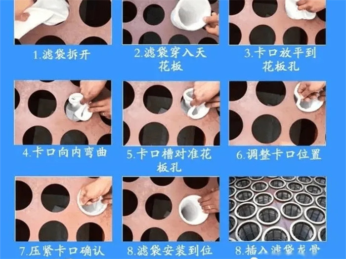 除塵布袋打開裝入花板孔,確認接縫處于橢圓直段的 位置。